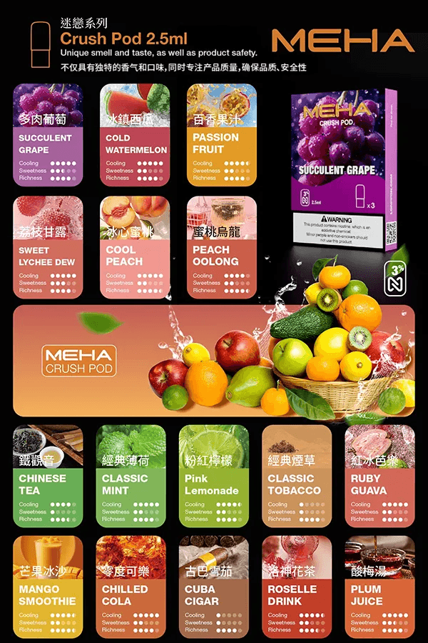 Meha 煙彈的Crush系列提供 16 種精緻口味選擇,一次滿足你的所有渴望: